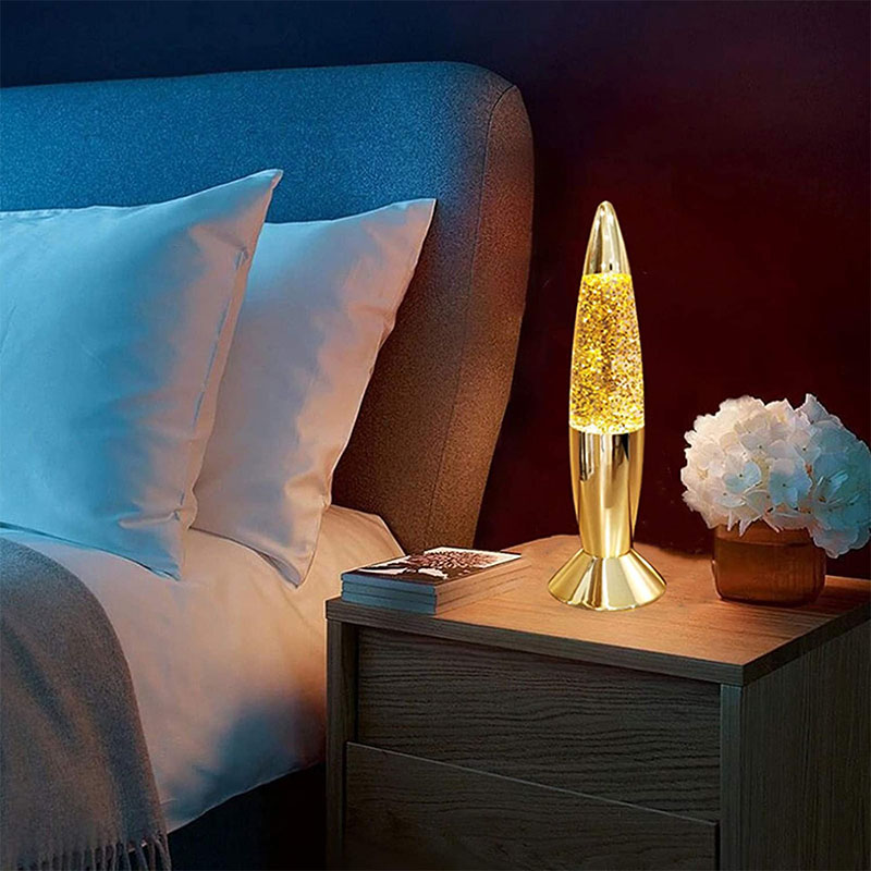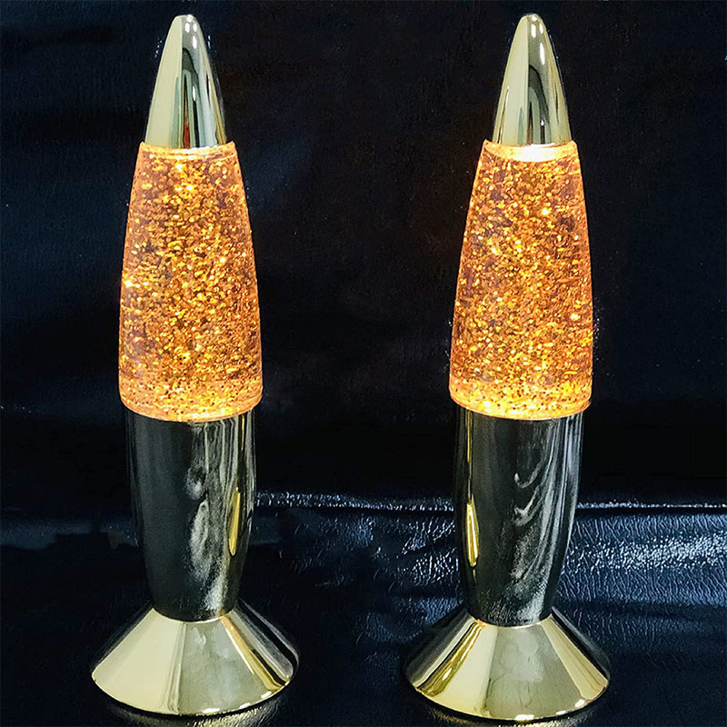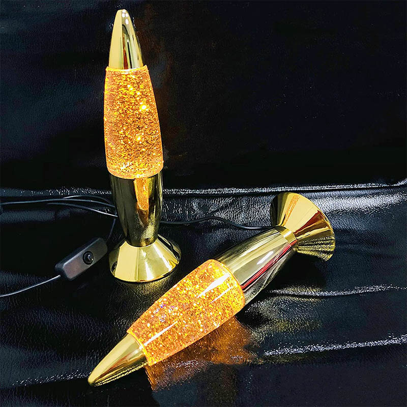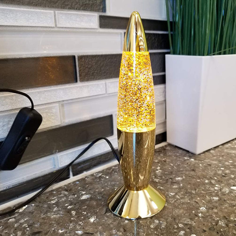 โคมไฟกลิตเตอร์ขนาด 7 นิ้ว มีของเหลวอยู่ภายในขวด ของเหลวจะเคลื่อนที่ไม่สม่ำเสมอหลังจากถูกทำให้ร้อน มีขวดสไตล์ที่แตกต่างกันและสีที่แตกต่างกัน