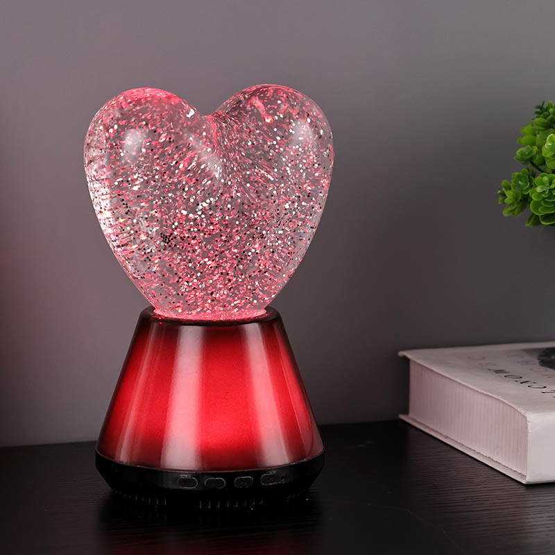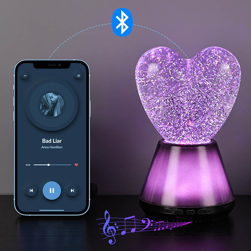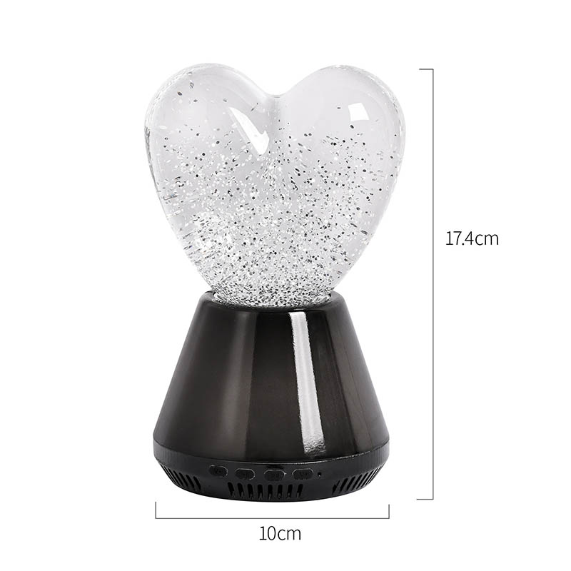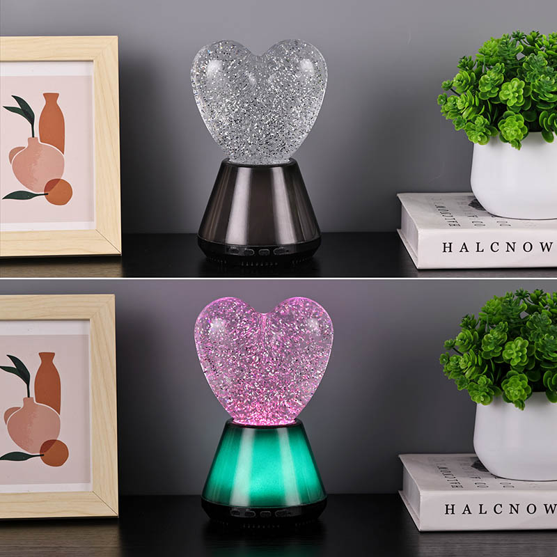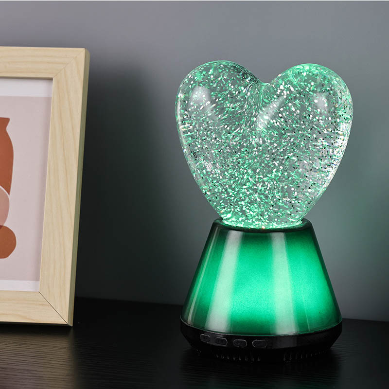 การตกแต่งภายในของระบบควบคุมด้วยบลูทูธทำให้ไฟกลางคืนรูปหัวใจแวววาวเต็มไปด้วยของเหลวลึกลับ ซึ่งมีเลื่อมเป็นประกายจำนวนนับไม่ถ้วนลอยอยู่ เมื่อเปิดหลอดไฟ ของเหลวจะค่อยๆ ไหลภายในลูกบอลแก้วรูปหัวใจ ทำให้เกิดเอฟเฟกต์เหมือนฝัน เลื่อมเหล่านี้ดูเหมือนดวงดาวที่กระจัดกระจาย ค่อยๆ ลอยอยู่ในของเหลว ทำให้ผู้คนรู้สึกเหมือนอยู่ในท้องฟ้าที่เต็มไปด้วยดวงดาว ไม่ว่าจะเป็นกลางวันหรือกลางคืน เฉดสีรูปหัวใจสามารถสร้างความประหลาดใจและความสุขให้กับเด็กๆ ได้ ช่วยให้พวกเขาปลดปล่อยจินตนาการท่ามกลางแสงไฟชวนฝัน