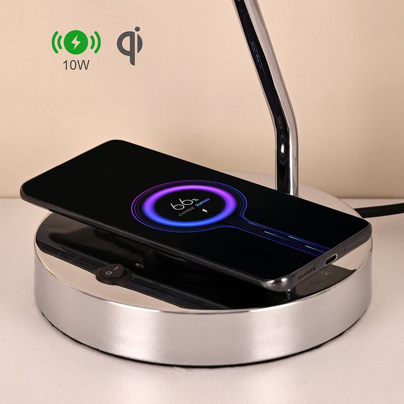 โคมไฟตั้งโต๊ะพร้อมที่ชาร์จไร้สายมีปุ่มควบคุมเปิด/ปิดที่ฐาน