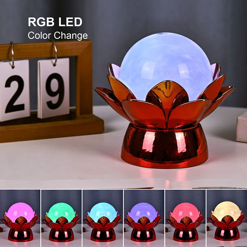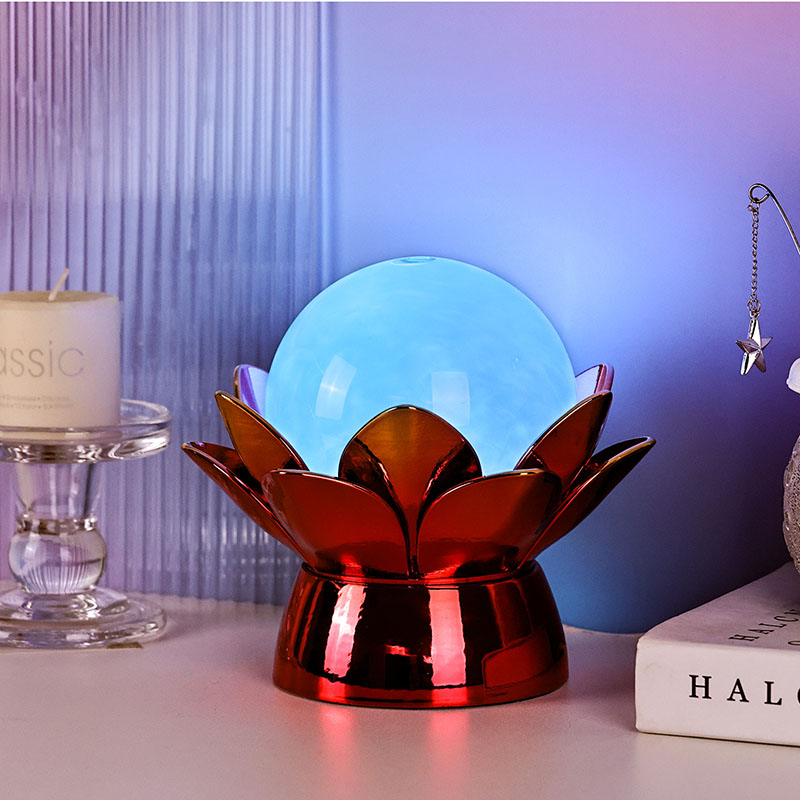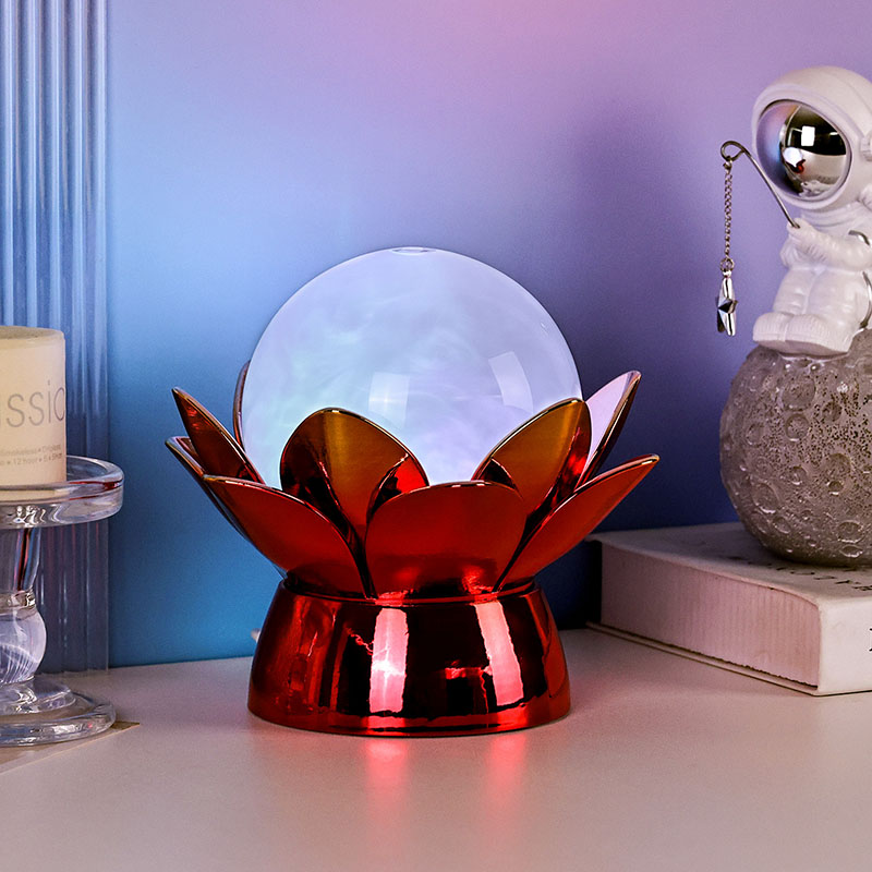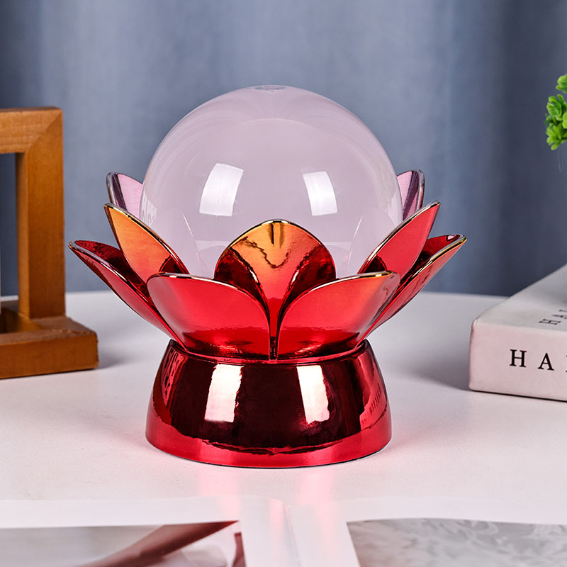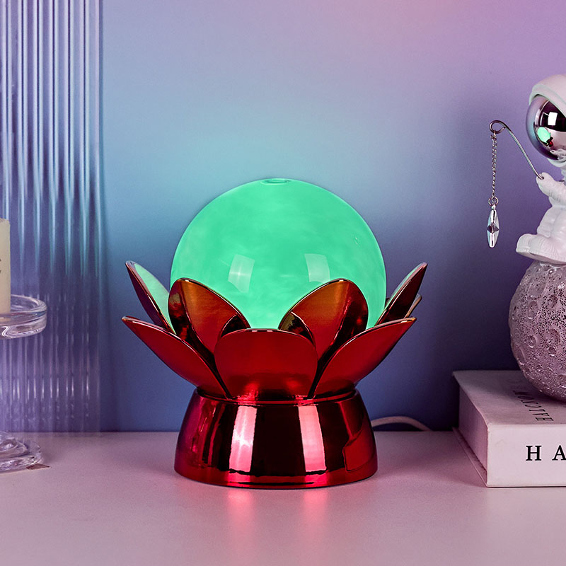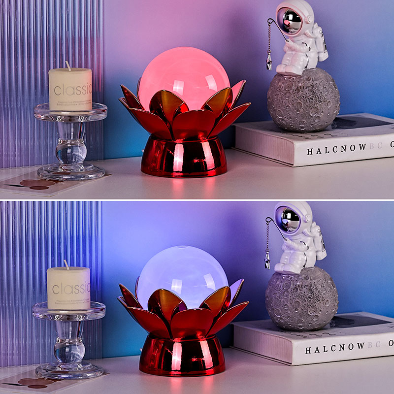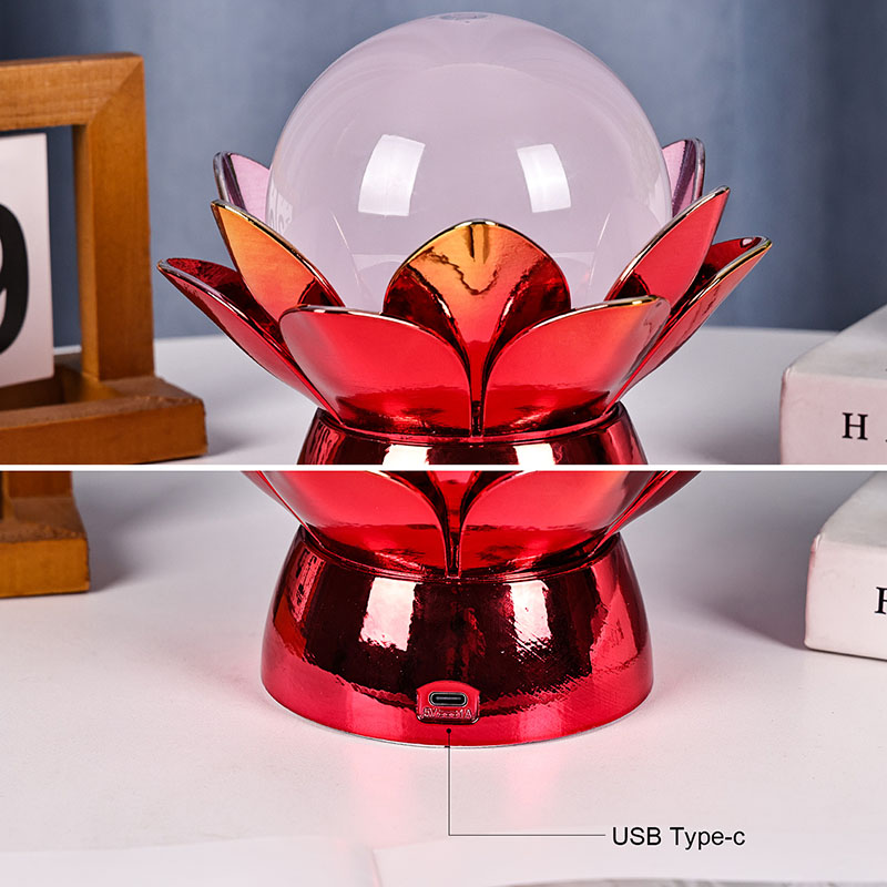 โคมไฟกลางคืน Lotus Cloud Globe อันน่าหลงใหล - การผสมผสานที่น่าหลงใหลของการออกแบบที่ได้แรงบันดาลใจจากธรรมชาติ บรรยากาศที่ผ่อนคลาย และเทคโนโลยีสมัยใหม่ โคมไฟตกแต่งที่หรูหรานี้มีลูกโลกแก้วโปร่งแสงที่เต็มไปด้วยของเหลวพิเศษที่จำลองเมฆที่ลอยอยู่ ทำให้เกิดบรรยากาศที่เงียบสงบและไม่มีตัวตนขณะที่มันหมุนวนและไหลอย่างอ่อนโยน ได้รับแรงบันดาลใจจากดอกบัวอันศักดิ์สิทธิ์ แสงยามค่ำคืนนี้วางอยู่บนฐานโลหะที่สร้างขึ้นอย่างสวยงาม มีรูปร่างคล้ายกลีบบัวที่กำลังเบ่งบาน เป็นสัญลักษณ์ของความบริสุทธิ์ ความสงบ และการตื่นรู้ทางจิตวิญญาณ