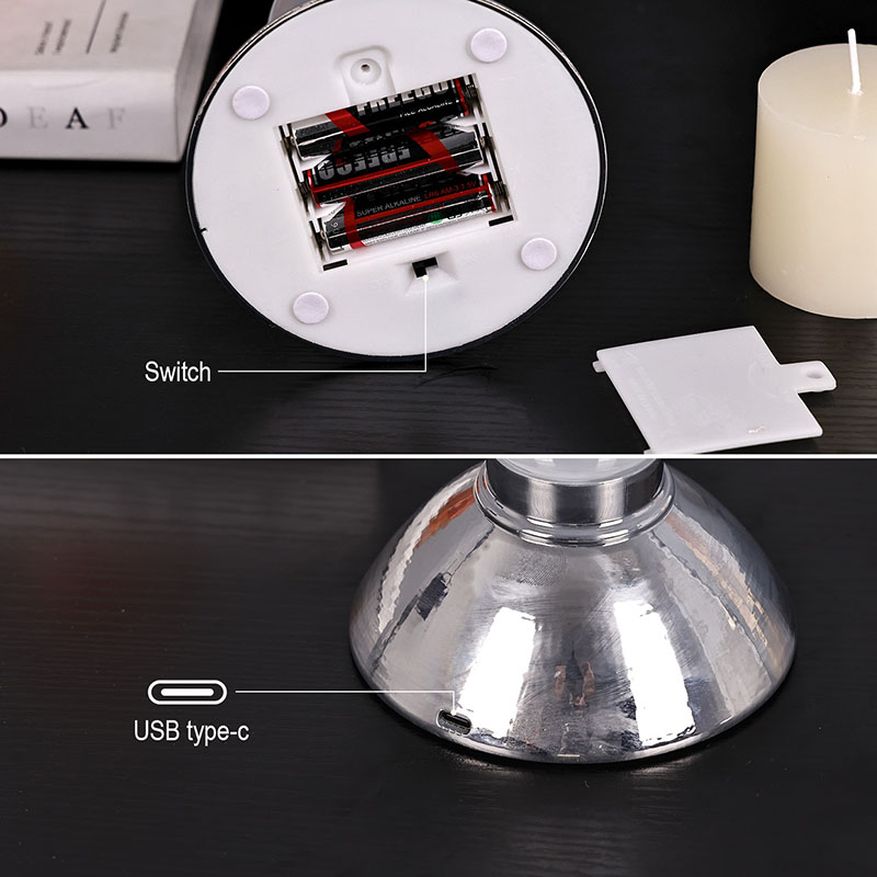 แบตเตอรี่ 3AAAแสงเทียนตกแต่งสไตล์ยุโรป ทำจากโลหะและพลาสติก โดยด้านบนและด้านล่างทำจากโลหะ ด้านบนสามารถวางเทียนที่ใช้ทั่วไปไว้จุดเทียนได้ ส่วนตรงกลางออกแบบเป็นรูปน้ำเต้าสไตล์ยุโรป