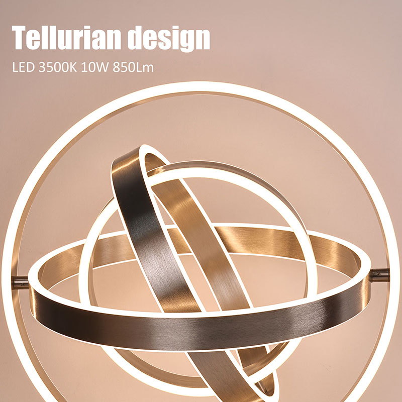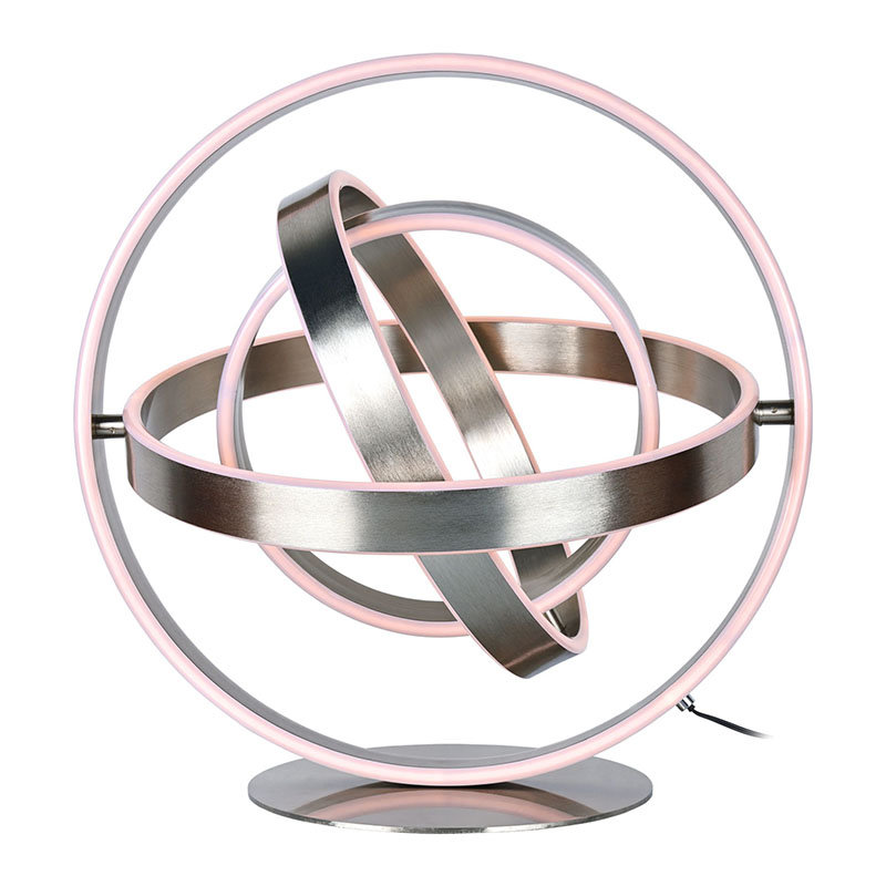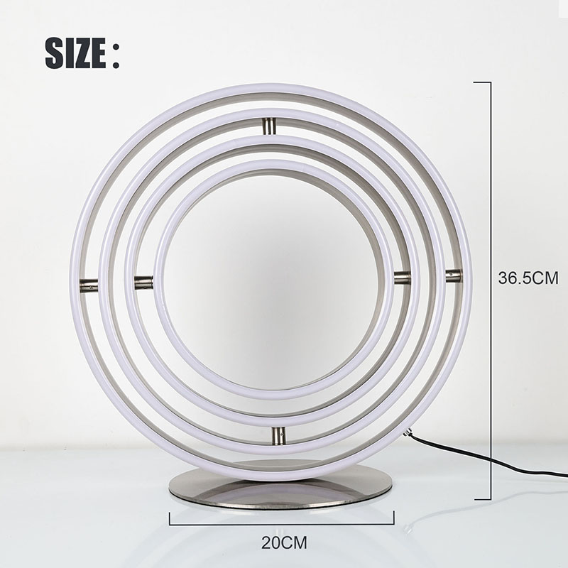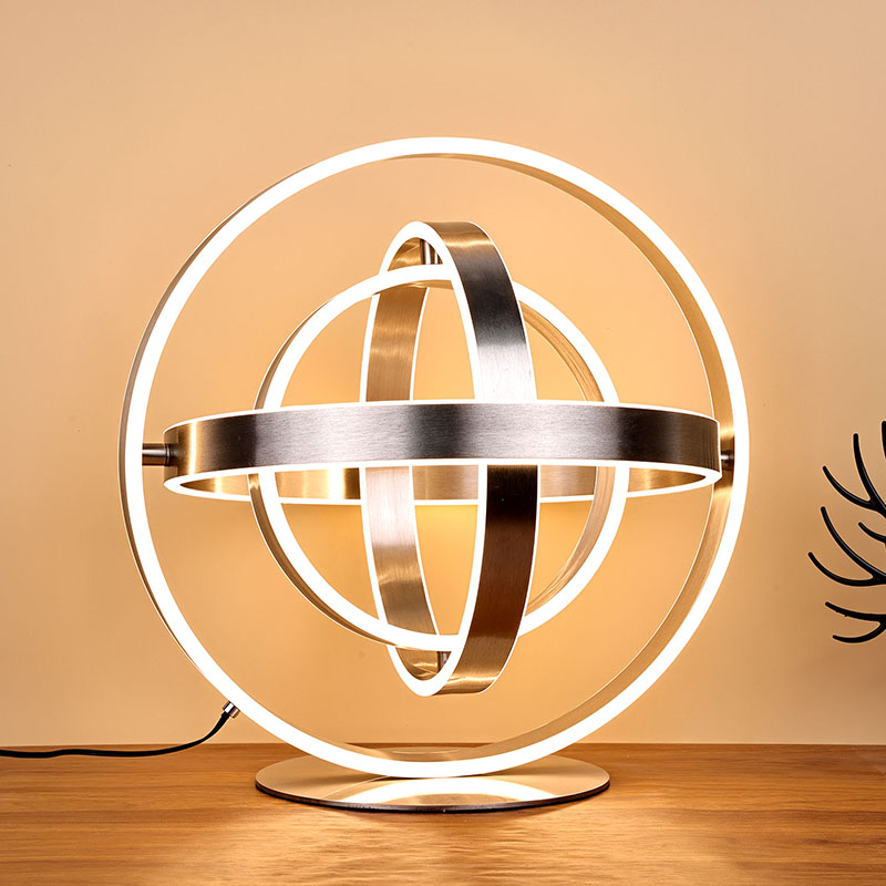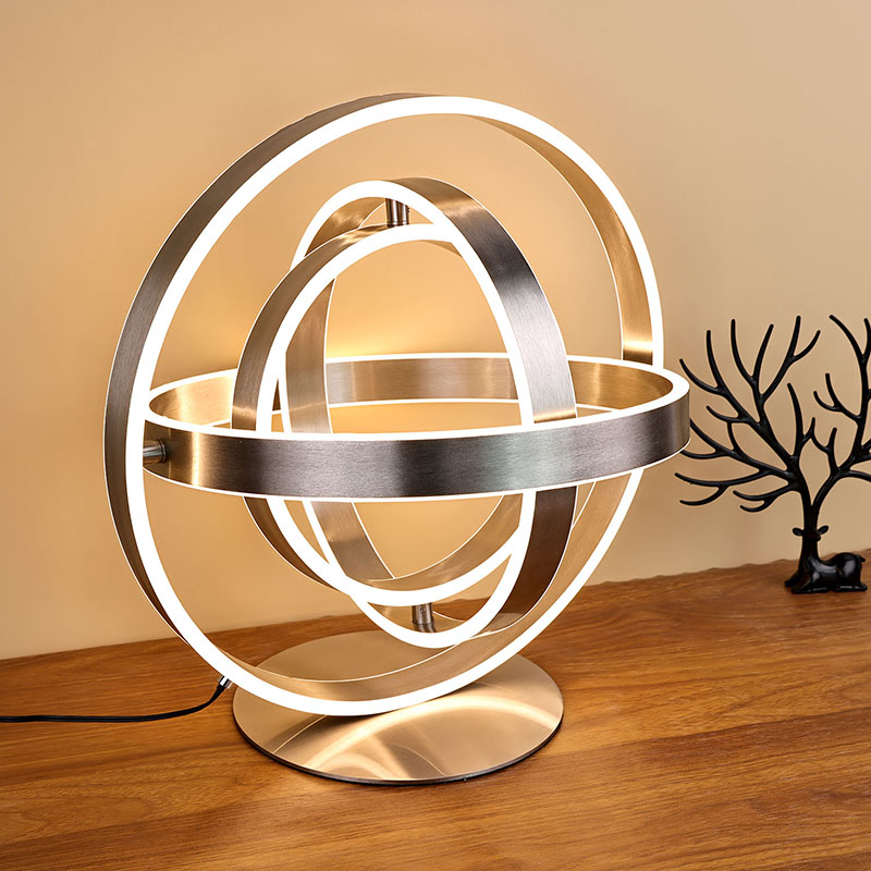 ที่โคมไฟตั้งโต๊ะ LED ที่สวยงามประกอบด้วยหลอดไฟ LED วงแหวนหลายดวง โดยมีไฟ LED ตัดเข้าไปในขอบวงแหวนแต่ละอัน การออกแบบวงแหวนสามารถหมุนเป็นรูปทรงกลมได้