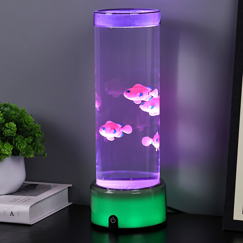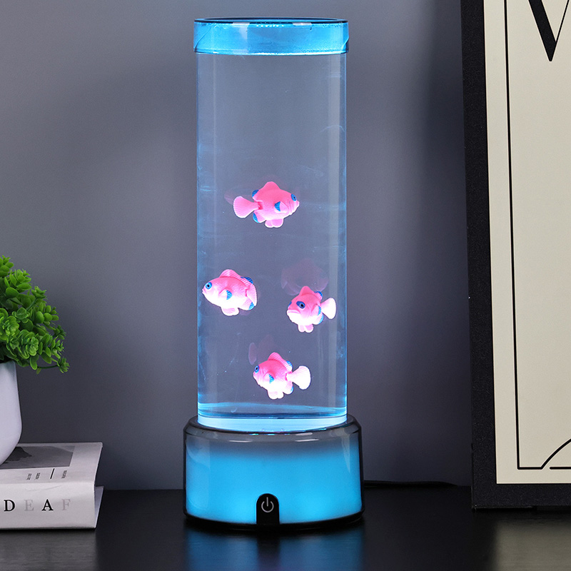 สวิตช์เลือกแบบสัมผัสและการว่ายน้ำของแมงกะพรุนโคมไฟแมงกะพรุนพร้อมโคมไฟตกแต่งฐาน RGB ของเล่นดูสำหรับเด็กที่ออกแบบใหม่พร้อมดีไซน์ทรงถังเก็บน้ำ หลังจากเติมน้ำแล้ว ก็จะใส่ปลาตัวเล็กสามตัวไว้ข้างใน โคมไฟแมงกะพรุนพร้อมฐาน RGB สามารถว่ายขึ้นและลงได้เมื่อมอเตอร์ขนาดเล็กที่ด้านล่างหมุน ในเวลาเดียวกัน ฐานมีการเปลี่ยนสี RGB จุดเด่นที่ใหญ่ที่สุดของผลิตภัณฑ์นี้คือฐานจะเปลี่ยนไปตามการเปลี่ยนสี การออกแบบพลาสติกทั้งหมดมีน้ำหนักเบามากโดยไม่ต้องกักเก็บน้ำ ซึ่งสะดวกในการขนส่ง แหล่งจ่ายไฟของโคมไฟปลานั้นมาจาก USB แรงดันต่ำชนิด C ซึ่งสะดวกมาก