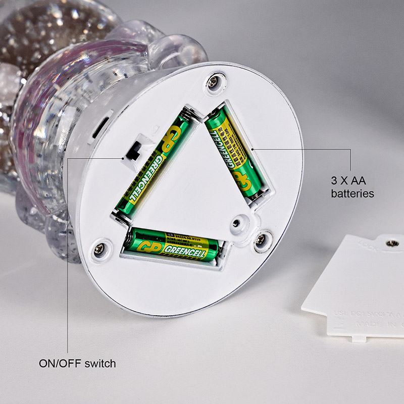 โคมไฟตั้งโต๊ะกลิตเตอร์ RGB เฉดสีหมูมีการออกแบบฐานสีขาวที่เรียบง่ายและสง่างามที่ด้านล่าง ซึ่งไม่เพียงแต่ช่วยเพิ่มความสวยงามโดยรวมเท่านั้น แต่ยังปรับปรุงความเสถียรเพื่อป้องกันการล้มอีกด้วย ฐานมีช่องใส่แบตเตอรี่ภายในซึ่งผู้ใช้สามารถติดตั้งแบตเตอรี่ AAA สามก้อนได้อย่างง่ายดาย (ไม่รวมมาด้วย) โดยไม่จำเป็นต้องเสียบปลั๊ก จึงพกพาสะดวกและเหมาะสำหรับวางข้างเตียง โต๊ะ เปล หรือระหว่างการเดินทาง การออกแบบสวิตช์นั้นใช้งานง่าย ช่วยให้ควบคุมการเปิด/ปิดได้ง่ายด้วยการสัมผัสที่เรียบง่าย ทำให้ปลอดภัยและใช้งานง่าย โดยเฉพาะอย่างยิ่งเหมาะสำหรับเด็กๆ ที่ใช้งานได้อย่างอิสระ