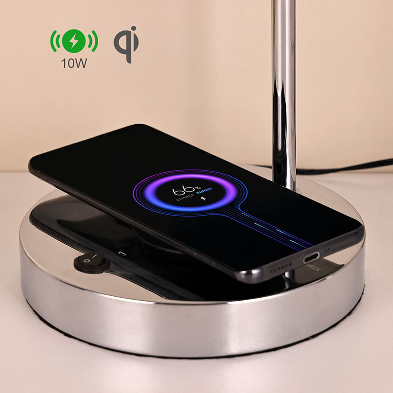 เพื่อความสะดวกของคุณ โคมไฟตั้งโต๊ะ LED QI พร้อมโป๊ะแก้วยังมาพร้อมกับฐานชาร์จโทรศัพท์มือถือไร้สายแบบโลหะอีกด้วย เพียงวางโทรศัพท์ที่รองรับการชาร์จแบบไร้สายเบาๆ ไว้บนฐานเพื่อการชาร์จที่รวดเร็ว โดยไม่จำเป็นต้องเสียบปลั๊กให้ยุ่งยาก เทคโนโลยีการชาร์จแบบไร้สายไม่เพียงแต่ช่วยเพิ่มความสะดวกในการใช้งาน แต่ยังหลีกเลี่ยงปัญหาสายไฟยุ่ง ทำให้เดสก์ท็อปของคุณเป็นระเบียบและสวยงามยิ่งขึ้น นอกจากนี้ฐานโลหะยังมีประสิทธิภาพการกระจายความร้อนที่ดีทำให้มั่นใจในความปลอดภัยและความน่าเชื่อถือของกระบวนการชาร์จ